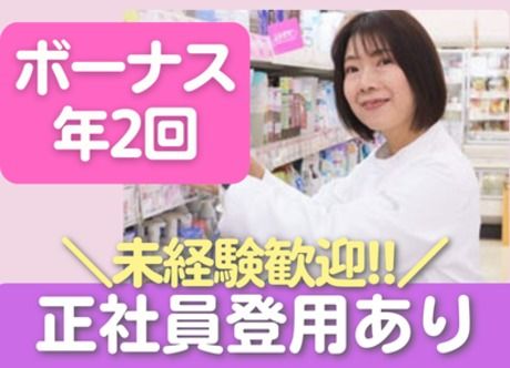 仕事内容 <この求人のポイント!> ■未経験・ブランクがあってもOK! 研修で丁寧にサポートするので、 未経験や久しぶりのお仕事でも大丈夫です! ■おしゃれも楽しめる♪ 髪型・髪色・ネイル自由(規定あり) ■うれしい待遇多数! ・賞与年2回(最大24万円/年)、土日祝時給+100円 ・社割あり(人気のコスメやサプリがお得に!) ・チーフ手当(最大時給+50円) ・資格手当あり(登録販売者:月最大15000円) ・社員登用あり 【仕事内容】 ・レジ対応、お客様のご案内 「〇〇はどこですか?」といったお客様のご案内など ・商品の補充や陳列 ・店内の清掃 などまずは基本業務からスタート! 慣れてきたら、チーフ候補として ・スタッフのシフト作成 ・スタッフへの業務指導・育成 ・季節やトレンドに合わせた売り場企画、ポップ作成 なども少しずつお任せしていきます。 <未経験でも安心!研修制度あり◎> 健康やサプリに関する知識を基礎から学べます。 先輩が優しく丁寧に教えるのでご安心ください◎ <資格取得も応援!> 登録販売者の資格取得も目指せます(手当あり) 将来的には社員登用も目指せます。 【やりがいを感じられるお仕事♪】 お店の雰囲気、商品の陳列方法まで、 アイデアを出し合いながら創っていきましょう! あなたのアイデアがお店の魅力に直結したり、 お客様に感謝されたり、 そんなやりがいを日々感じられるお仕事です。