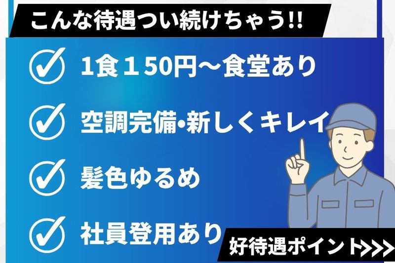 求める人材: 経験不問・未経験OK! 前職は接客業や保育士などさまざまな経歴の方が活躍中! コツコツ・モクモク働きたい!と工場デビューする方も多数 大手で働きたい! とにかく稼ぎたい! 直接雇用を目指したい! など気軽な志望動機でお問い合わせください 友達同士で応募もOK! 20代~40代の男女が多数活躍中です!