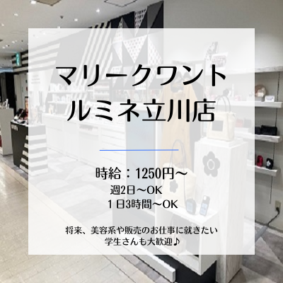 仕事内容 ⭐マリークワントショップでの化粧品・アパレル雑貨の販売⭐ コスメやファッション・アクセサリーなどの 多彩な商品をお客様にご案内するお仕事です。 ≪具体的には…≫ ⏩お客様へコスメ、ファッション商品のご提案 ⏩店舗のレイアウト変更 ⏩商品や備品の補充 ⏩店舗の清掃 etc. タッチアップの業務はないので 未経験の方でも安心してお仕事できます。 \こんな方にオススメ/ 学生・フリーターなど20~30代中心に活躍中!! 将来、美容系や販売のお仕事に就きたい 学生さんも大歓迎♪ 募集職種:アルバイト