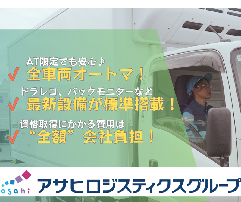 仕事内容 \\ ✨当社のここが魅力です✨ //  ̄ ̄V ̄ ̄ ̄ ̄ ̄ ̄ ̄ ̄ ̄ ̄ ̄ ̄ ̄ ̄ ̄ ̄ ✅1:運転中は「ひとり時間」 一度センターを出発すれば、 そこはあなただけの空間です。 好きなラジオなどを聴きながら リラックスして運転できます。 配送先での挨拶は必要ですが、 長時間の接客トークは一切なし。 気持ちの切り替えがしやすい環境です。 ✅2:未経験でも安心の「AT車」 「トラックなんて運転できるかな…」 その不安、不要です! 今の普通免許(AT限定)があればOK。 入社後に会社の費用負担で 免許のグレードアップも可能です。 一生モノのスキルが手に入ります! ✅3:冬道も怖くない「全車4WD」 柏崎の冬、雪道は心配ですよね。 でもご安心ください。 当社のトラックは全部「4WD」! 坂道も雪道も安定して走れます。 安全への投資は惜しみません。 ✅4:大手企業ならではの”福利厚生” 充実した福利厚生制度をご用意! 誕生日プレゼント・宿泊施設の補助券交付 テーマパークの割引チケット・ シーズンシート・お祝い金・お見舞い金・ マイホーム購入奨励制度 といったユニークな福利厚生などもあり! ┏━━━━━━━┓ ◆ お仕事内容 ◆ ┗━━━━━━━┛ 2トン・3トンのATトラックで コンビニエンスストアに食品を お届けするルート配送をお願いします。 セブンイレブン様のお弁当やお惣菜、 おにぎり等を配達・納品するだけ! ケースの中身を仕分け・検品しなくて 良いのでとてもラクですよ! 配送先は新潟県中越が中心となります! 県外・長距離はございません! ~~~ 1日の流れ(例) ~~~ 06:00 / 出勤(朝礼) ▼ 06:30 / トラックに午前中にお届けする 商品を積込し、センターを出発 ▼ 10:00 / 午前中の納品終了。 センターへ戻る ▼ 11:00 / センターへ到着。 午前中の配送業務日報入力 ▼ 11:00 / 1時間休憩 ▼ 12:00 午後にお届けする商品を トラックへ積込し出発。 ▼ 15:30 / 午後の納品終了。 センターへ戻る ▼ 16:00 退勤(終礼) ※一部残業発生する可能性あり ~~~~~~~~~~~~~~~ 【入社後について】 いきなり現場デビューさせることはございません! 下記のように、約3ヶ月間の時間をかけて、 順序立てて不安を解消しながら進めていきます。 〈中型を未取得〉 ・近隣の自動車学校に通い免許を取得 →トータル時間15時間ほどで取得できます。 ▼ ・経験有無に関わらず、助手席に乗って 業務の流れ等を先輩スタッフと確認。 ・グループ会社の研修センターで新任研修 ┏━━━━━━━━┓ ◆ 当社について ◆ ┗━━━━━━━━┛ アサヒロジスティクス株式会社の グループ会社として 全国15か所にセンターがございます。 当グループでは、福利厚生・資格の補助・ 女性就労のバックアップ等が強み。 中型・大型免許支援、女性専用車等、 の施策を行っております。 HP:https://www.asahilogistics.co.jp/