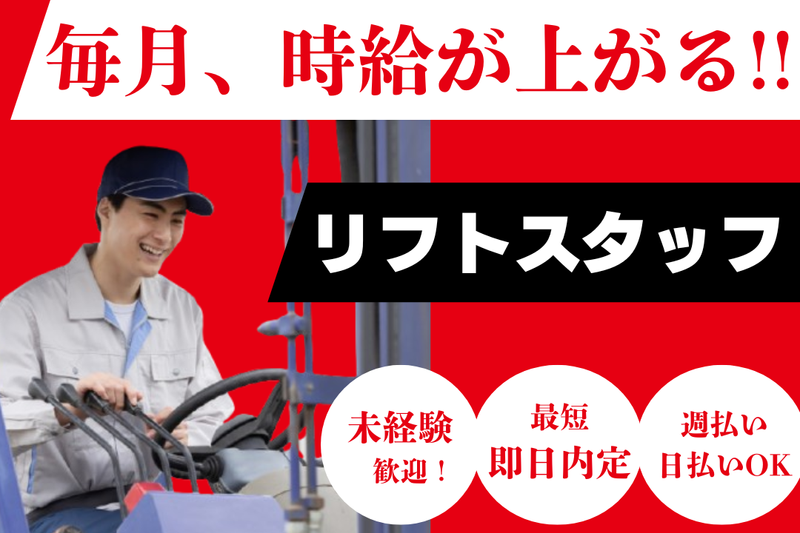 ■求める人物像・資格 *<これは必須!!>* -フォークリフト技能講習修了者 *<こんな方優遇します!!>* -リフトの実務経験が豊富な方 *<こんな方歓迎します!!>* -未経験だけど興味がある方 -モクモク作業・裏方作業がしたい方 -責任感をもって業務に取り組める方 -ほどよく体を動かしながら働きたい方 -ブランクOK!久しぶりの仕事復帰の方 …………………………………………………………………… 日本語能力試験 N2以上 日本語の読み書き(漢字・かな)必須 JLPT N2+ / Must read & write Japanese (kanji & kana) ……………………………………………………………………