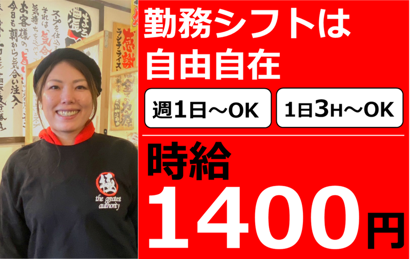 仕事内容 【アピールポイント】 *<未経験OK>慣れるまでしっかりサポートします。バイトデビューも大歓迎! *<週1日~OK>勤務シフトは自由自在!平日のみ、土日祝のみもOK!シフトはお気軽にご相談ください。 *<まかない有り>お店の美味しいまかないが食べられます。 *<オンライン面接OK!>もちろん来店での面接もOK!ラーメンもご馳走しますよ。 *<業界未経験OK!>経験は問いません!居酒屋など飲食店での業務経験があれば尚可。 *<主婦(夫)パートさん活躍中>9:00~15:00など、日中の空いた時間を有効活用しませんか? 【仕事内容】 ・座席案内 ・オーダー ・配膳 ・片付け ・その他、備品の補充など *食券制のお店なので、はじめての方でもスグに慣れていただけるお仕事です。 ≪1日の流れ(例/ランチタイム)≫ 09:00 出勤:開店準備(お掃除、卓上のセッティング、簡単な仕込み) 10:20 開店前のブレイクタイム 10:30 開店(営業スタート:接客・商品提供など) 14:00~14:10 ブレイクタイム 15:00 片付け、退勤/おつかれさまでした! 【お店のコンセプト】 地域の若い世代の方を中心に好評をいただいている横浜家系ラーメン! お昼休みなどはサラリーマンさんなども多くいらっしゃいます。 未経験スタートの先輩スタッフが多数在籍&活躍中! しっかりサポートしますので、未経験でも安心です。 週1日からOKで、短時間からのシフトもOKなので、子育て世代の方も働きやすい職場です。 シフトの相談など、お気軽にご連絡ください。 一緒にお店を盛り上げてくれる方大歓迎!ぜひご応募ください♪