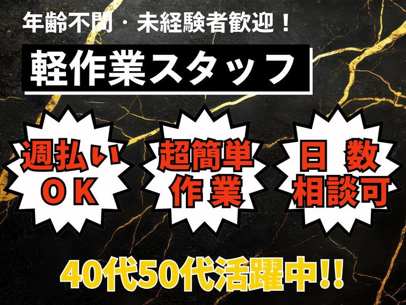 求めている人材 <こんな方におすすめ!> ・体を動かすのが好きな方 ・軽作業・清掃・内装補助などの経験を活かしたい方 ・建築・内装・リフォーム業界に興味のある方 ・短期でしっかり稼ぎたい方 ・安定して働きたい中高年・シニアの方 \20代〜50代まで幅広く活躍中!/ 未経験から始めた方が多数定着しています!