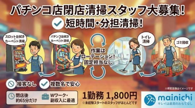 65分の短時間のパチンコ閉店後清掃✨月収36,000円可|WワークOK