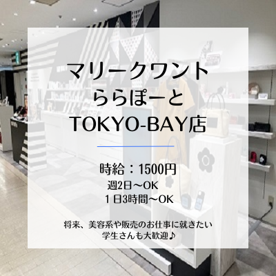 仕事内容 ⭐マリークワントショップでの化粧品・アパレル雑貨の販売⭐ コスメやファッション・アクセサリーなどの 多彩な商品をお客様にご案内するお仕事です。 ≪具体的には…≫ ⏩お客様へコスメ、ファッション商品のご提案 ⏩店舗のレイアウト変更 ⏩商品や備品の補充 ⏩店舗の清掃 etc. タッチアップの業務はないので 未経験の方でも安心してお仕事できます。 \こんな方にオススメ/ 学生・フリーターなど20~30代中心に活躍中!! 将来、美容系や販売のお仕事に就きたい 学生さんも大歓迎♪ 募集職種:アルバイト