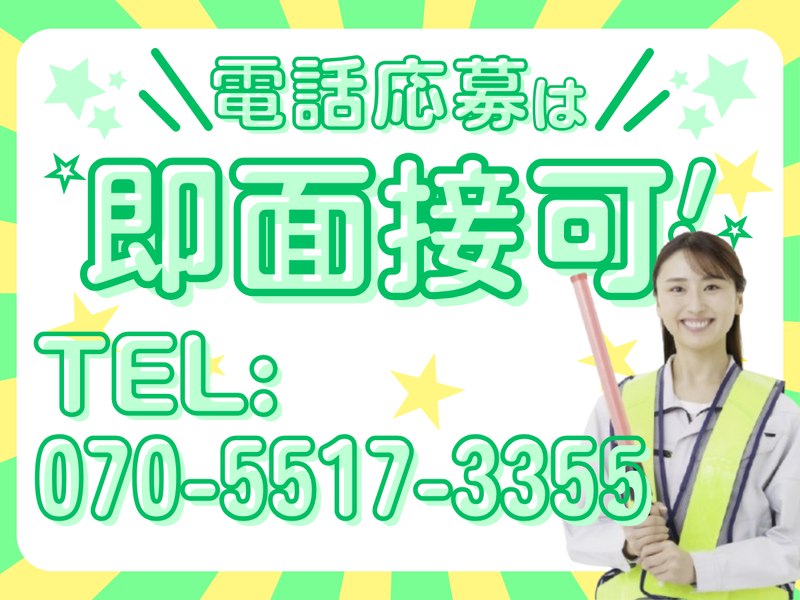 仕事内容 <日給保証あり!早上がりあり!✨> ═════✨ココがポイント✨═════ ⏩難しい作業はなし!男女問わず活躍中◎ ⏩早く終れば即帰宅OK♪日給保証あり! ⏩全員と面接!すぐに稼ぎたい方は電話で ⏩借上社宅あり!仕事も住居も同時にGet ⏩給与は日払いOK!急な出費でも安心♪ ════════════════════ *電話応募は即面接可能✨* TEL:070-5517-3355  ̄ ̄ ̄ ̄ ̄ ̄ ̄ ̄ ̄ ̄ ̄ ̄ *面接時に履歴書は不要✨ ・氏名 ・メールアドレス ・生年月日 ・性別 ・電話番号 これだけで面接まで進めて手間ナシで採用まで◎ ════════════════════ ╭━━━━━━━━━━━━━━━╮ ⭐複雑な作業なし!警備のお仕事 ⭐ ╰━━━v━━━━━━━━━━━╯ <警備スタッフ募集> 交通誘導の警備業務をお任せします! ▶生コンクリートの現場で狭い道路を ミキサー車が邪魔にならないように 誘導棒を使って、交通の誘導等をお願いします。 都内に勤務地複数あり♪