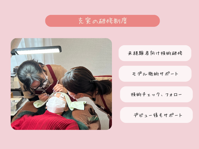 アピールポイント: 「一人ひとりに向き合いながら、無理のないペースで施術したい」 JEWELは、効率と仕上がりのバランスを大切にするサロンです。 ノルマや過度な詰め込みはなく、 落ち着いた客層の中で、質の高い施術に集中できます。 * 無理な詰め込み・ノルマなし * 落ち着いた客層で働きやすい * 未経験でも最短1〜3ヶ月でデビュー可能 * 頑張りがしっかり給与と歩合に反映される * 有給取得率100%、産休育休実績あり “長く働けるサロン”を探している方に向いています。