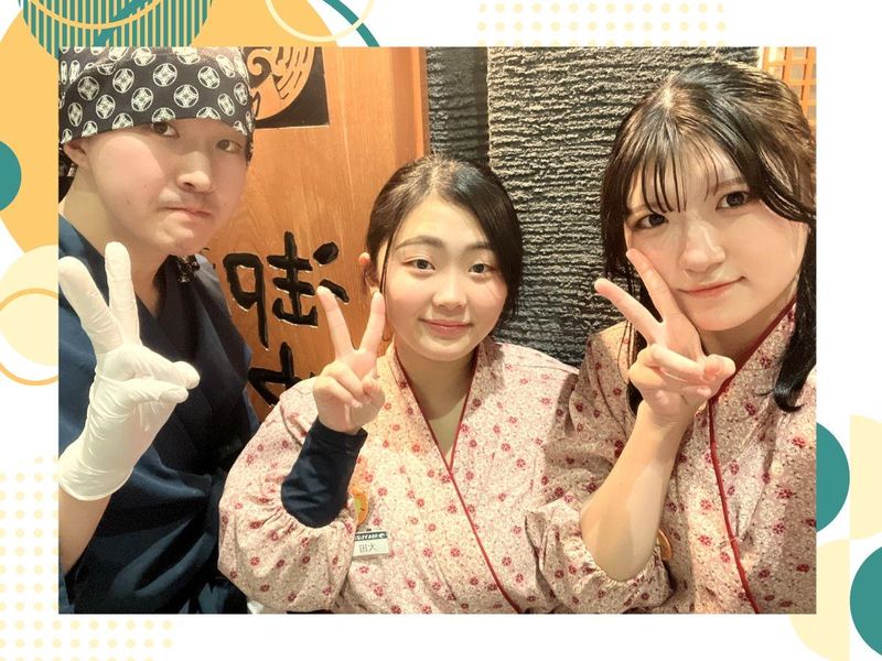 職場環境 在籍スタッフはほぼ学生! バイトの時間もとにかく楽しい! ほとんどのスタッフが 未経験スタートです◎ 「別々の高校へ進学した地元の友達と 一緒のバイト先で働きたい」 「1人で応募は不安だから、 友達も誘って働きたい」 そんな声も大歓迎!