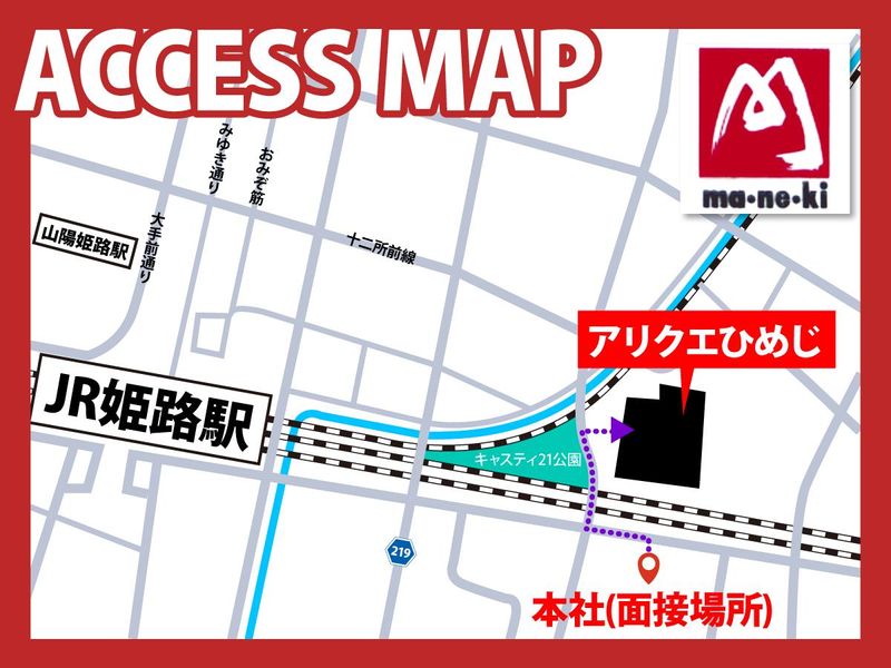 選考プロセス 7~8名採用予定! 面接には履歴書(写真付き)をご持参ください。 面接時、「遅れそう」「道に迷ってしまった」「どうしても都合が悪くなった」 …そんな時はお電話下さいね。 面接でお会いできるのを楽しみにしています! もし、通勤にお困りなことがあれば、なんでも相談してください! 【面接地・登録地】 まねき食品株式会社 本社 所在地:兵庫県姫路市北条953 担当者:採用担当 電話番号:0792240255