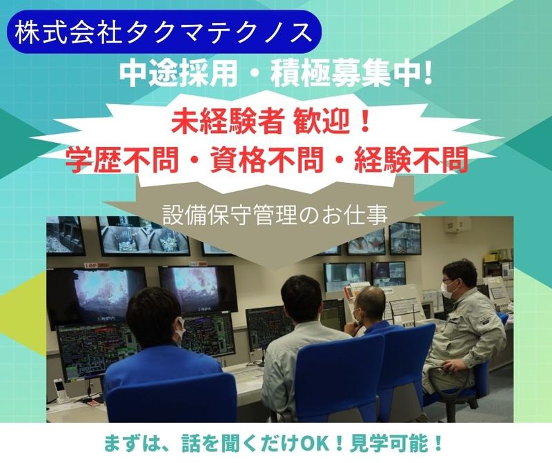 メッセージ 〇〇〇〇〇〇〇〇〇〇 \未経験歓迎!/ \特別な知識や経験は必要ありません!/ 『基本から丁寧にお教えします!』 〇〇〇〇〇〇〇〇〇〇 ~~リアルな社員の声~~ 入社後に資格を取得できるので 「この資格が無いから応募できない」 ということはありません! 私自身、まったくの未経験からの 入社でしたが 資格取得奨励制度を使って 「ボイラー関連の資格」を取得しました その他にも「電気工事士」の資格など 様々な資格が取得しやすい環境だと思います! 会社の雰囲気も良く 和気あいあいとした職場です! 上司や周りに相談もしやすいですね! それは『タクマテクノス全体の風土』だと 感じています! ~~~~~~~~~~~~~ 夜勤シフトも慣れれば負担は少なく 休日の自由時間もたっぷり! 「平日の休みや自由時間も多いので、 役所・銀行・病院など行きやすいです」 「朝早く起きる必要があるのは 1直勤務のみなので、 朝が弱い自分にはとても合っています」 特別な知識や経験は必要なし!入社後は先輩スタッフが基礎から丁寧にお教えします! 労働者派遣事業(派33-300443) 職業紹介事業(33-ユ-300208)