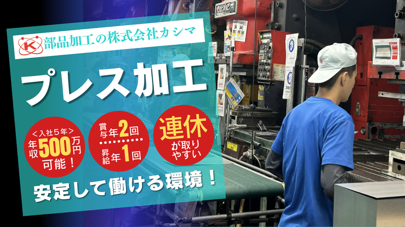 仕事内容 プレス加工 \具体的な業務/ 60t~200tまでのC型クランクプレス及びサーボプレスにて加工します。 \当社について/ 1948年に創業し 長きにわたり部品加工の分野で 厚い信頼をいただいてきた株式会社カシマ 2009年には 大手ノーリツグループ「(株)アールビー」の 100%出資子会社となり、 体制を強化して成長を続けています。 今回、更なるニーズ増加を見越して 製造部門の責任者を 募集することになりました。 長い歴史と高い技術力のある当社で これまでの経験を活かして ステップアップしませんか?
