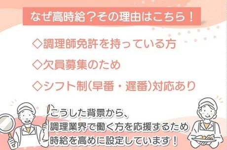 仕事内容 調理や食材の仕込み、盛付け、洗浄、片付けなど、調理師としての資格と経験を活かせる業務全般をお任せします。これまで培ってきたスキルをしっかり評価する、高時給のお仕事です。 利用者様一人ひとりの栄養状態に配慮しながら、お食事を通じて健康を支えるやりがいのある環境。経験を活かし、即戦力としてご活躍いただけます。 また、介護食など専門的な知識も身につけることができ、スキルアップにもつながります。安定した環境で収入とやりがいの両方を大切にしたい方におすすめです。 献立作成なし◎スキルを活かして活躍できます。 栄養士が考案した栄養バランスの取れたメニューに基づき、お食事を提供しています。献立作成は栄養士が担当しているため、調理師としての経験やスキルを活かし、調理業務に専念できる環境です。 食材の仕込みから調理、盛付けまで一連の業務をお任せするため、これまで培ってきた経験を発揮しながらご活躍いただけます。効率よく作業を進められる体制が整っており、現場の流れもつかみやすいのが特徴です。 ◇【高時給1,600円】で安定収入を実現! 現在、体制強化に伴う増員募集のため、期間限定で高時給にてご案内しています。 これまでの経験やスキルをしっかり評価。安定した収入を実現できる環境です。 1日8時間・月21日勤務の場合、月収26万円以上も可能です◎ フルタイムでしっかり働きたい方や、収入アップを目指したい方にもおすすめです。 また、高時給だからこそ無理なく安定した働き方ができるのも魅力のひとつ。経験を活かしながら、収入面でも安心して長く働ける職場です。