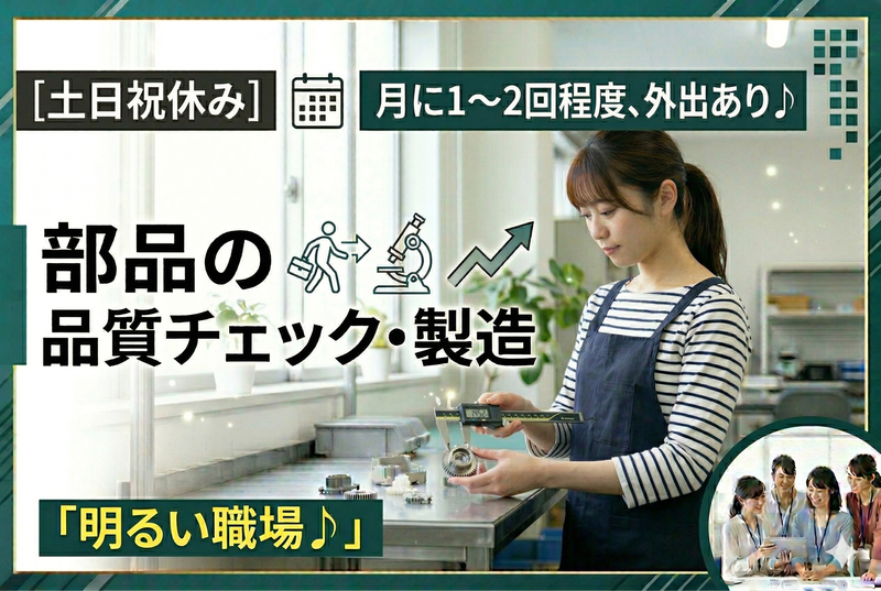 仕事内容 ⭐おすすめポイント⭐ 自分時間を大切に できる職場♪ 土日祝休み&残業なし。 私服で通勤OK! 18時にはパッと帰れるから、 仕事終わりのヨガや 買い物も余裕です♪ 今の環境で、 「立ち仕事が多くて、 毎日ヘトヘト…。」 「将来のことを考えると、 長く続けられるか不安。」 そんなお悩みをお持ちの方へ。 創業90年を迎える安定企業で、 ムリなく働けるお仕事を、 始めてみませんか? 【 求人のポイント 】 ◆創業90年、 「ISO9001」「ISO14001」 「ISO45001」取得の企業 ◆土日祝休みで年間休日120日以上 ◆残業はほとんどありません ◆座り作業メインで体力負担少なめ ◆未経験から始められる充実の教育 ◆私服で通勤OK! 【 お任せするお仕事 】 米粒からPC画面サイズの、 プラスチック製品を扱います。 < 具体的には… > ・専用機器での数値測定 ・キズや欠けの目視チェック ・簡単なバリ取り作業 ・3DCAD・測定器を使用した 業務 重いものを運ぶような、 力仕事はありません。 ずっと座りっぱなしだと、 少し肩が凝ってしまう…。 そんな心配も無用です。 仕事に慣れてきたら、 お客様との打ち合わせなど、 営業サポートもお任せします。 月に1〜2回程度、 外出して気分転換もできますよ♪ 【 圧倒的な安定感 】 当社は創業90年。 品質管理、環境、労働安全衛生の 国際規格である、 「ISO9001」 「ISO14001」 「ISO45001」を取得しています。 確かな実績があるからこそ、 腰を据えて長く働ける環境です。 【 自分の時間も大切に 】 土日祝休みに加えて、 年間休日は120日以上。 残業もほとんどありません。 仕事終わりの予定も立てやすく、 家庭との両立もしやすい環境です。 自分の時間を大切にしながら、 ムリなく働き続けられますよ◎ もし仕事内容に 興味を持っていただき、 アルバイト・パートでなら 働きたいと ご検討いただいている方は 是非ご相談ください!
