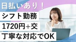 インフォメーション 未経験からオフィスワークデビュー*PCスキルかんたんで〇 \ATM監視センターの問い合わせ窓口/ 丁寧な対応ができればOK!未経験歓迎! ≪長くはたらくほどプラスアルファで手当ゲットのチャンス!≫ 今回は、ATMの監視センターのコールセンターでお問合せ対応をおまかせします! 銀行ATMをご利用のお客様からATMの操作方法やカードの紛失についてなど! 丁寧な電話応対ができればオペレーター経験は不問! 未経験でも安心して始められる環境です! 少しでも気になった方、ぜひお早めのご応募お待ちしております! *レゾナゲートは来社不要!WEB登録可能です! 給与日払い制度「Res給」&週払い制度「前給」あり!スマホでできちゃう無料PC講座も多数実施中* アピールポイント 株式会社レゾナゲートの求人を見ていただきありがとうございます! ◆当社の特徴1 WEBで完結・来社不要! ◆当社の特徴2 高水準・高時給のお給料&待遇! ◆当社の特徴3 最短翌日入金! 日払い制度「Res給」・週払い制度「前給」あり! ◆当社の特徴4 あなたもご家族も安心!健診サポート! 株式会社レゾナゲートでは 一般事務やデータ入力のお仕事だけでなく コールセンターでのテレフォンオペレーターや WEBディレクター、デザイン制作などクリエイティブ系のお仕事まで幅広くご紹介ができます! 「週2~、週3~で働きたいけどどうだろう・・」 「アルバイトやパートの経験しかないから不安・・・」 「ブランクあるけどどうだろう・・・」 ぜ~~んぶお気になさらず! あなたに合ったお仕事をご紹介します! ハローワークでお仕事をお探し中の方も こんな仕事ないかな?という方も お気軽にお問い合わせください!