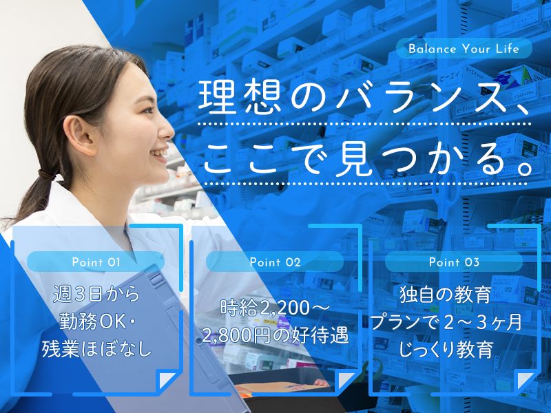 仕事内容 プライベートも大事にしながら のびのび働きませんか? **************** POINT ✅週2.3日から勤務OK ✅残業ほぼ無し! ✅時給2,200~2,800円の好待遇 **************** 現場に慣れていただくために 調剤業務・窓口業務・接遇まで 管理薬剤師がしっかり指導いたしますのでご安心ください! <仕事内容> ●調剤・服薬指導 ●薬歴簿の記入(手書き) ●薬の販売・接客 など 当薬局の薬歴管理は「手書き」です。 あえて手書きにこだわる理由は、 患者様の細かな症状まで深く理解し、 適切な管理を行うため。 手を動かして記録することで 薬剤師としての知識がより早く、 着実に身につく環境です。 ※現在、配達業務や在宅業務はありません。 店舗での薬剤師業務に専念できます。