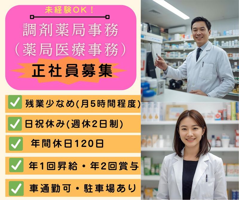 メッセージ \未経験者歓迎/ \調剤薬局事務(薬局医療事務)へ キャリアチェンジする方応援!/ ◎残業月平均5時間◎ ◎年1回昇給・年2回賞与(計3.0か月分)あり ◎日祝+その他休み(週休2日制) ◎車通勤(マイカー通勤)可 ◎駐車場あり ================== 長期勤続によるキャリア形成を図るため 年齢制限を設けさせていただいております ================== ▽▽▽▽▽▽▽ ☆こちらのお仕事は、 企業様からお預かりし 転職エージェント『しごと計画学校』が ご紹介するお仕事です 『しごと計画学校』については 下記「その他欄」に記載しておりますので ご参考ください 今までの経験・資格・スキルすべて問いません!!「キャリアチェンジ」「挑戦しようとする気持ち」応援! 職業紹介事業(33-ユ-300208) 労働者派遣事業(派33-300443)
