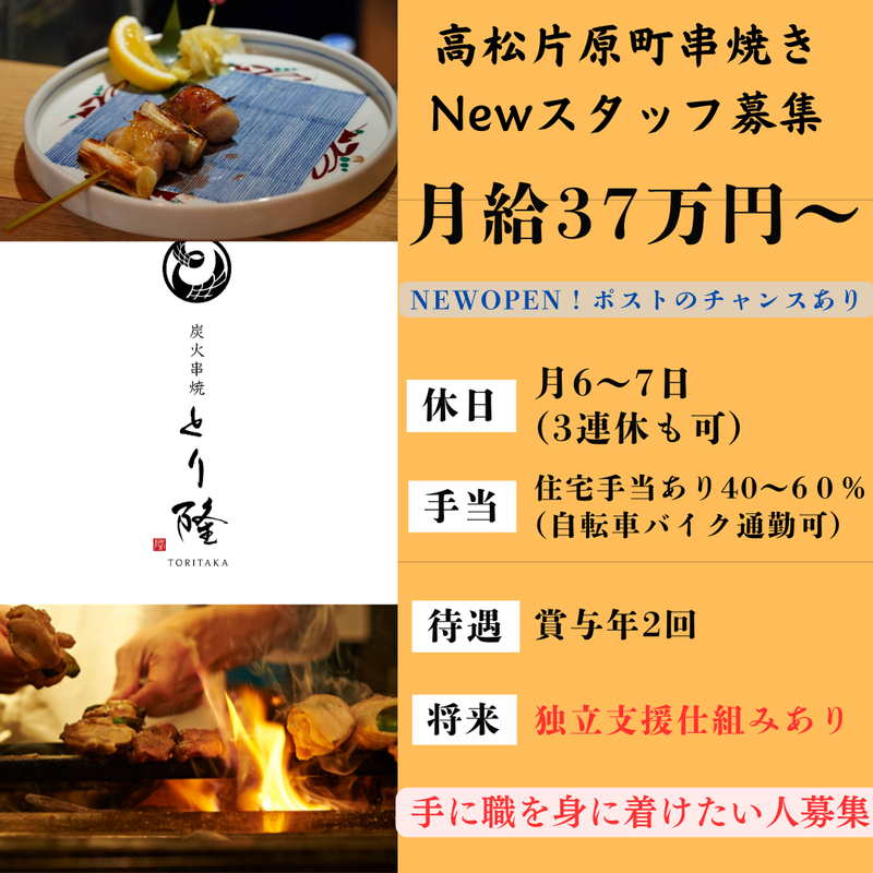 仕事内容 \将来独立も応援!正社員大募集!/ 2025年にオープンしたばかりの 本格炭火焼鳥専門店での店舗業務全般。 串打ち・仕込み・炭火での焼鳥調理や 一品料理の調理、接客・料理や ドリンク提供、食材仕入れ・在庫管理など できることから少しずつお任せします。 店長候補として将来的には店舗運営、 メニュー開発もしていただきます。 ━━━━━━━ 未経験者も歓迎 ━v━━━━━ 未経験でも月給37万円スタートです! 飲食業界デビューOK! 第二新卒・フリーター大歓迎!! ━━━━━━━ 経験者は優遇! ━v━━━━━ 早い段階で「焼き台」も任せます! 独立希望の方もしっかりサポートします!