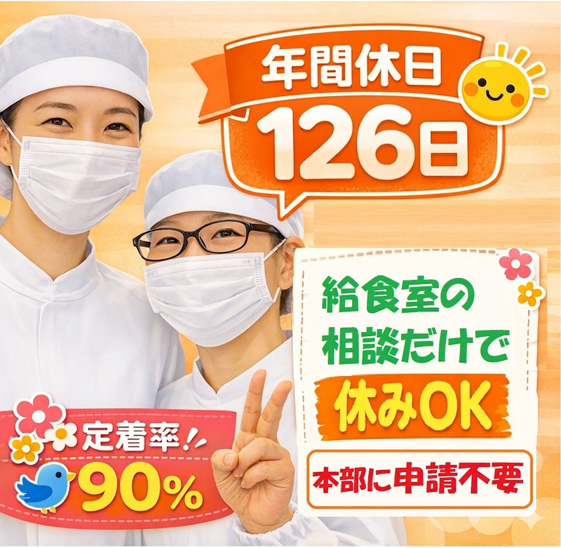 職場環境 2026年8月に新規オープンの給食室 創業60年以上のノウハウとマニュアルも完備していますが、ルールが決まりきっていないからこそ、働きやすさを自分たちで作れる環境です。 長く安定して働きた方、オープニングスタッフとして一緒にスタートしませんか 受動喫煙対策あり(屋内禁煙)