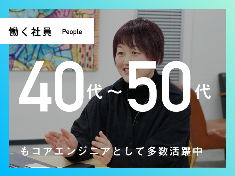 職場環境 40代・50代も経験を活かしプロジェクトのコアメンバーとして活躍中! 技術や経験、知見に対するリスペクトは大切にし 年齢や役職に関わらず、フラットな人間関係を築ける職場です。 服装:スーツまたはビジネスカジュアル (クールビズ期間中はネクタイ、上着省略可) 喫煙所:なし(敷地内全て禁煙)