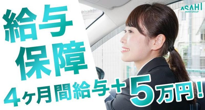 アピールポイント: 安心の給与サポート!4ヶ月間×毎月給料+5万円! アサヒタクシーグループ所属の安定企業! ・給与保障あり!4ヶ月間給与に5万円プラス(計20万円)! ・女性乗務員活躍中、女性設備あり! ・多くの自社無線で稼げる! ・アサヒタクシーグループ所属!