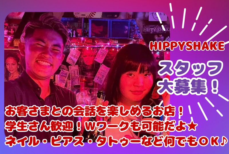 仕事内容 大画面から流れる超最新USヒットが 大迫力!洋楽が楽しめるお洒落なbar 「ヒッピーシェイク」です! 新清水駅から徒歩3分とアクセス抜群◎ お客様と一緒に楽しもう(≧▽≦)♪ 新しい仲間を大募集! 元気で明るい接客ができればOK! 現在は20代・30代・40代の 男性&女性が活躍中(男女比は半々☆) 現在は20代の学生さんが多く活躍中♪ 主婦さん・Wワークさんも在籍中! ■■■■■■■■■■■■■■■■■■■■ 【?】どんなお仕事?  ̄ ̄ ̄ ̄ ̄ ̄ ̄ ̄ ̄ ̄ 接客メインでカウンター業務と ホール業務を担当していただきます! *カウンター: お客様との会話やお皿洗い 会話が弾んで楽しいッ(ノ゜▽゜)ノ *ホール: 注文取り、テーブル片付けなど ■■■■■■■■■■■■■■■■■■■■ 【?】お酒は飲めなくてもいい?  ̄ ̄ ̄ ̄ ̄ ̄ ̄ ̄ ̄ ̄ ̄ ̄ ̄ ̄ ̄ はい!お酒は飲めなくても大丈夫です! 実際に飲めないスタッフもいますし 逆にガッツリ飲める・お酒が好きな スタッフもいますよ~(>ω・)/ お酒の種類が分からなくても 働くうちに覚えられるので大丈夫! ■■■■■■■■■■■■■■■■■■■■ 【?】服装・髪色とかルールはある?  ̄ ̄ ̄ ̄ ̄ ̄ ̄ ̄ ̄ ̄ ̄ ̄ ̄ ̄ ̄ ̄ ̄ ◎服装の指定なし ◎髪型・髪色自由 ◎ネイルOK ◎ピアスOK ◎タトゥーOK ◎なんでもOK☆ 自分らしく働けるお店です! ⭐入社時期の相談OK⭐ 「冬期休暇に入るタイミングでお仕事開始」 など気軽にご相談ください!