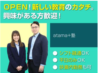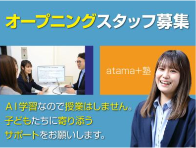 仕事内容 例えば、 「教職を目指し 大学生活 を送ってるが、 必修や実習で忙しい。。 でもホンネは、塾でバイトがしたい。」 : 「そもそも、シフト都合がつかないと 迷惑かけそうだし。。。」 ― という 学生さん や、 「主婦として 子育てがひと段落 したし、 教免を活かして活躍したい」 : 「でもホンネは、いきなりフルタイム や 週5 での 社会復帰 は ブランクが不安」 : 「そもそも、最近の塾のシステムや 事務的作業はできるか不安。。」 ― という 主婦さん の、 いちばん 大事 な (=私たちが、いま、必要 としている) 「(誰かを)サポートする・応援する」 キモチ 「(ご自身も)頑張ろうとする」 想い 私たちに、応援させてもらえませんか? その キモチ・想い、 ムリなく・自分らしく 存分に活かして頂ける 新しい「教育」のカタチ。 『 atama+塾 』 で お待ちしています。 * ━━━━━━━━━━━━━━━━━━━━ “ What's 『atama+』(アタマプラス)? ” ━━━V━━━━━━━━━━━━━━━━ 各メディアで取りあげられる話題性 だけでなく その教材は全国区有名大学で活用される 信頼と実績。 それが、AIを活用した新しい学習塾 「進学個別 atama+塾 (以下atama+塾)」 全国規模で語学教育を展開する KDDIグループ・イーオンホールディングス が、 新フランチャイズ事業 として進める 新しい “学びのあり方” です。 <一人ひとりの歩みを重視する 逆算学習> <最高効率で自信に繋げる AI超精度学習> <時代にFITした スーパーフレックス制> etc... ━━━━━━━━━━━━━━━━━━━━ “ POINT! 『校舎運営サポート事務』 ” ━━━V━━━━━━━━━━━━━━━━ ≫≫ 「オープニング大募集」 ≪≪ ≫≫ 「教育業界」未経験歓迎 ≪≪ ≫≫ 安心の「KDDIグループ」≪≪ 塾講師や教育関係の 資格・経験は問いません。 小学生から高校生までの 【生徒の伴走者】として、 子供たちの成長をサポートする 教室運営を行う方の募集です。 勉強を教えることは一切ありません。 授業はAIが行うため、 未経験の方でも活躍いただけます。 ━━━━━━━━━━━━━━━━━━━━ “ FAQ 『 採用担当より 』 ” ━━━V━━━━━━━━━━━━━━━━ Q.【具体的な仕事内容】は?? A. ・校舎長不在時の校舎運営業務補助 ・生徒の学習進捗管理 ・生徒への声がけ/サポート ・教室の清掃・機材・備品の管理 ・他、各種事務作業 など 生徒への授業・教科指導は行いません。 あくまでも、「atama+塾」の事務として 校舎長をサポートする業務がメインです。 だから、 <生徒一人ひとりにしっかり寄り添う> ことに、 <あなたの時間とチカラ> を ムリなく注いでいただき、 生徒たちの将来の夢の実現に向け ともに喜び・励まし(時に息抜きし) 成長を支える存在でいて下さい。 * Q.【具体的な1日の流れ】は?? A. 開校前の準備 …教室環境の整備、来塾する生徒の確認 ▼ 生徒が来塾 …学習の進捗・スケジュール、 学習内容の確認 ▼ 学習 …学習方法の指導、生徒のケア ▼ 生徒面談 …将来の夢や志望校の相談、 学習進捗・学習方法の指導 ▼ 生徒が帰宅 …学習成果に対する声がけ 通塾スケジュールの確認 ▼ 本部報告 …日報などの記入 必要な知識、生徒対応力、コーチングなど、 応募時に経験は問いません。 ※詳しくは下記HPもご参照下さい https://apjuku-aeon-recruit.com/