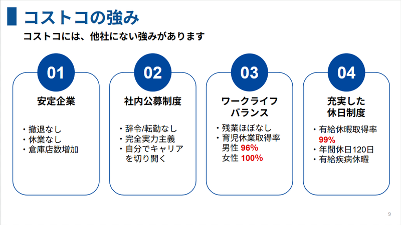選考プロセス はじめまして! コストコホールセールジャパン株式会社 群馬明和倉庫店の採用担当でございます。 この度は、数ある求人広告の中から ご応募をご検討いただきまして 誠にありがとうございます。 ご不明点やご不安な点は ございませんでしたでしょうか? どんな些細な事でも お答えさせていただきますので お気軽にご質問ください。 後程弊社担当からご連絡 させていただきますので よろしくお願いいたします。 あなたと一緒に働けることを スタッフ一同心待ちにしております。
