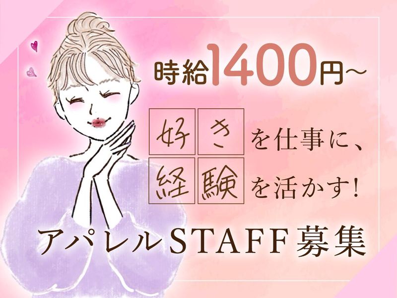 仕事内容 ■-■ ○ *スタッフ大募集* ○ ○ ○ ○ お客様のお気に入りの ○ ○ 一着を選ぶお手伝い♪・。 ○ ■-■ **************** * 業界未経験大歓迎 * * 販売・アパレル未経験OK * **************** 【仕事内容】 ・お客様への接客、販売 ・商品の陳列 ・ディスプレイ在庫管理 ・レジ業務 など、 季節・トレンドに合ったアイテムを提案したり、 アドバイスや相談に乗ったり… 気付いたら会話も弾み、 楽しくやりがいのあるお仕事です◎ *・・*・・*・・*・・*・・* ★接客の楽しさを実感!★  ̄V ̄ ̄ ̄ ̄ ̄ ̄ ̄ ̄ ̄ ̄ 「SNSで見て気になって来ました!」 「店頭にあった商品が可愛くて入ってみました!」 様々なお客さんがご来店されます◎ 何気ない声掛けから会話が生まれ、 接客が「楽しい♪」と実感できます! あなたらしく接客してください◎ お話が好きな方やアドバイスが好きな方に ピッタリのお仕事です★ ★未経験でも安心スタート!★  ̄V ̄ ̄ ̄ ̄ ̄ ̄ ̄ ̄ ̄ ̄ ̄ ̄ 基本的にお店は2~3名体制で、 接客未経験の方やアパレル未経験の方も 安心してスタートしていただけます! わからないことは先輩スタッフに 何でも聞いてください! 丁寧にサポートします★ ★働きやすい職場環境!★  ̄V ̄ ̄ ̄ ̄ ̄ ̄ ̄ ̄ ̄ ̄ ̄ ̄ 20代~40代まで幅広いスタッフ活躍中☆ 各方面からの通勤にも便利な立地です! 「早番終わりに買い物して帰ろう♪」 なんてことも可能です◎ 髪型・髪色も自由で、ネイルもOKなので、 自分らしくオシャレしたまま働けます* ★バイヤーなどにも挑戦可能★  ̄V ̄ ̄ ̄ ̄ ̄ ̄ ̄ ̄ ̄ ̄ ̄ ̄ 未経験で入社して、 ゆくゆくは販売以外も目指したい! そういった方にはピッタリ◎ 「バイヤー」「ディレクター」 など、服と関わりながら どんどん成長していくことも出来ます!