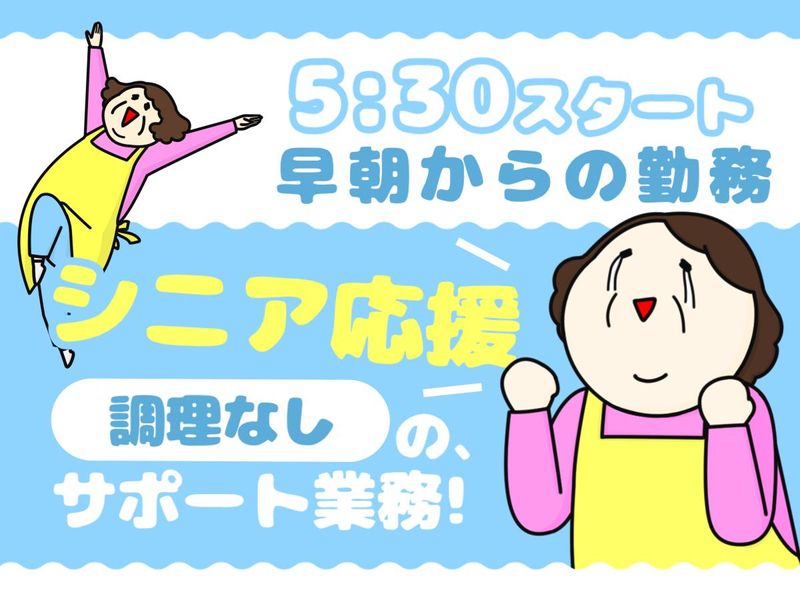 仕事内容 \早朝を活かして健康&充実/ ★セカンドステージを応援★ _______________ ◎「朝型生活」が心地良い方へ◎  ̄ ̄ ̄ ̄ ̄ ̄ ̄ ̄ ̄ ̄ ̄ ̄ ̄ ̄ ̄ 「朝は早く目が覚めてしまう…」 「午後からは自分の時間に充てたい」 そんな思いを持たれる 50代&60代の方が多く活躍中◎ <…お任せする業務…> ◆ 料理の仕上げや盛り付け ◆ 食事の配膳準備 ◆ 食洗機での食器の洗浄と片付け 面倒見の良い先輩スタッフが イチから丁寧にお教えします♪ \✨ここがオススメ!働くメリット✨/ ⏩生活リズムが整う!健康維持にも◎ 早朝から適度に体を動かし、 「午前中」or「お昼過ぎ」には 仕事を終えることで、 規則正しい生活習慣が自然と身につく! ⏩即戦力になる「家事の知恵」 長年ご家庭で培ってきた手際の良さ、 盛り付けの工夫など、 あなたの「台所経験」が活かせます◎ ⏩週3日~応相談◎ がっつり稼ぎたい方は、 週4日・5日勤務も歓迎! ムリなく働きたい方は… 「5:30~9:30」 安定した収入が欲しい方は… 「5:30~14:00」 シフトは気軽にご相談ください◎ * ゜*+:。:+* ゜*+:。:+* ゜*+:。:+* ゜*