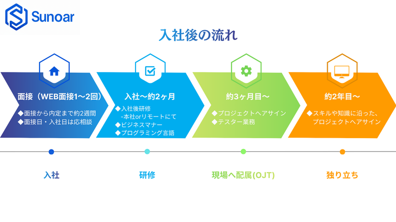 仕事内容 【会社HP】 https://www.sunoar.co.jp/ ⭐ システムエンジニアやアプリの開発メンバー募集! ⭐ 未経験から“手に職”をつけて、システムエンジニアとしてキャリアをスタートしませんか? スノアでは、会社の成長と一緒に、自分自身も大きく成長できるチャンスがあります! \この求人のおすすめポイント/ ・未経験から着実にシステムエンジニアになれる ・3ヶ月の研修で基礎から学べる!専任講師&先輩が徹底サポート ・研修期間中は研修以外の業務なし!安心して学習に集中できる ・フラットで風通しの良い環境!若手でもどんどん挑戦できる ・リモート案件あり/柔軟な働き方も実現可能 ✅ 仕事内容 まずは研修で基礎を身につけ、その後はお客様先でバックエンド開発やシステム設計・運用に携わっていただきます。 ・業務システムやWebサービスのサーバサイド開発 ・データベースの設計や運用 ・API設計や機能改善提案 経験やスキルに応じて、少しずつステップアップしていけるので安心です。 さらに「もっと効率的にできるのでは?」「新しい技術を試してみたい!」という提案も大歓迎。 あなたのアイデアがシステムの改善・会社の成長につながる環境です。 <使用技術例> ・Java ・Spring Framework ・SQL(MySQL / PostgreSQLなど) ・Docker、AWS 等のクラウド技術 ✅ 学習支援 未経験から安心してスタートできる研修をご用意しています。 ・プログラミング基礎(Java/SQL) ・サーバサイド開発研修(Spring Bootなど) ・データベース設計・運用実習 ・実際の開発プロジェクトを想定した実践的カリキュラム 研修後は先輩と2人1組でプロジェクトに参加できるので「1人で放置される…」なんてことはありません。 また、研修期間中に研修以外の業務をお願いすることはありませんので、安心して学習に集中できます。 ⏩ 未経験の方は… 基礎をしっかり学んでから現場デビュー! ⏩ 経験のある方は… 要件定義や設計フェーズにも関わるチャンスがあります。 ✅ 当社について スノアはまだ成長途上のベンチャー企業。 だからこそ「裁量権の大きさ」と「スピード感」が魅力です。 新しいことに挑戦したい方、会社の成長と一緒に自分も成長したい方にピッタリの環境です。 「未経験からシステムエンジニアに挑戦したい!」 「研修がしっかりある会社で安心してスタートしたい!」 「バックエンド技術を極めてキャリアアップしたい!」 そんな方はぜひご応募ください!
