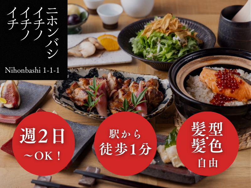 仕事内容 ✅春バイトにもぴったり! ✅ 週2日~、1日4時間~OK! ✅ 日本橋駅から徒歩1分 ✅ 髪型・髪色は自由♪ ✅ 飲食店での経験がある方、歓迎! \ 春に向けてNEWスタッフ募集 / 卒業前の高校生も、春からの新生活に備える学生さんも大歓迎! 「ちょっと働きたい」も「がっつり稼ぎたい」も、どちらも叶います◎ _________________ ⭐お仕事はコチラ!  ̄ ̄ ̄ ̄ ̄ ̄ ̄ ̄ ̄ ̄ ̄ ̄ ̄ ̄ ̄ ̄ ̄ 日本橋エリアにある和食レストラン&バー 『ニホンバシ イチノイチノイチ』で キッチン業務をお願いします。 <具体的には…> ・食材カットなどの仕込み ・料理の盛り付け など _______________ ⭐春休みも柔軟対応!  ̄ ̄ ̄ ̄ ̄ ̄ ̄ ̄ ̄ ̄ ̄ ̄ ̄ ̄ ̄ ・「進路決定済みだから卒業前にバイトしたい」 ・「春から学校が始まるまでのつなぎで働きたい」 ・「受験終わりでサクッとバイトしたい」 そんな希望も大歓迎!もちろん長期も大歓迎です◎ 【POINT】 ◎短期だけのスポットバイトもOK ◎長期でしっかり入りたい方には週4日~のシフトもご用意 ◎春からの新生活資金をしっかり稼げます♪ _______________ ⭐上質な環境でスキルアップ  ̄ ̄ ̄ ̄ ̄ ̄ ̄ ̄ ̄ ̄ ̄ ̄ ̄ ̄ ̄ 旬の食材を使った調理や、 盛り付けの美しさを大切にした料理が中心。 他店では味わえない和の技や、 一歩上の調理スキルも身に付けられます! _______________ ⭐おしゃれOK!自分らしく働ける  ̄ ̄ ̄ ̄ ̄ ̄ ̄ ̄ ̄ ̄ ̄ ̄ ̄ ̄ ̄ 髪型・髪色は自由! 「卒業前の思い出作りに、ちょっとバイト」もOK♪ まずはお気軽にご応募ください! 短期でも長期でも、あなたの「働き方」に合わせてシフト調整します♪