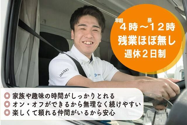 仕事内容 オフィス・スーパーマーケット・飲食店・学校等をルートでまわり、廃棄物をパッカー車で回収するお仕事です。 初めての方も、慣れるまでは先輩社員と2人1組で作業をし、丁寧に指導いたしますのでご安心ください! 事前に決まっている担当ルートで回収作業をするので、土地勘のない方も大歓迎! 2~3tパッカー車を運転して頂きますが、従業員の多くも未経験からスタートした方が多数活躍中! 嬉しい免許取得支援あり!(自己負担ほぼなし) 安心してスタートできる環境を整えています。 ●2026.2月に新社屋へ移転! ◎高知市春野町弘岡へ本社(勤務地)移転します! キレイでおしゃれな本社で働くことができます〇 【ポイント】 朝4時スタート・正午に終了。 家族との時間も、夢を追う時間も大切にできるドライバー職! 多くの収集業者が深夜スタートの中、当社は朝4時始業・正午就業。 午後は自分時間に使えるため、「家族とゆっくり過ごしたい」「趣味や夢に打ち込みたい」そんな方にピッタリです! 例えば... ◎ダンサーや音楽活動♪ ◎副業や資格取得を目指してる ◎趣味やトレーニングに時間を使いたい そんな『何かを頑張る人』も応援します!! 安定した【株式会社ダイセイ】グループの一員として、地域の"きれい”を守りながら、自分の夢も追える環境で一緒に働きませんか! 【充実した福利厚生】 ◆厚生労働省:女性活躍推進【えるぼし】三ッ星認証企業 ◆高知県ワークライフバランス推進認証企業 ◆高知市男女共同参画推進企業表彰受賞 《主な制度》 ・社会保険完備 ・退職慰労金(勤続5年以上) ・定年60歳・再雇用制度65歳まで ・制服支給あり ・駐車場完備(月3,000円個人負担) ・育児時間短縮制度 ・介護時間短縮制度 ・敷地内禁煙 《ダイセイオリジナル制度》 ・ダイセイ専用コミュニケーションアプリ「TUNAG」導入 ・連続4〜5日好きな時に休めるリフレッシュ休暇 ・個人の通院入院で利用できるハイパー医療保険加入(会社負担)