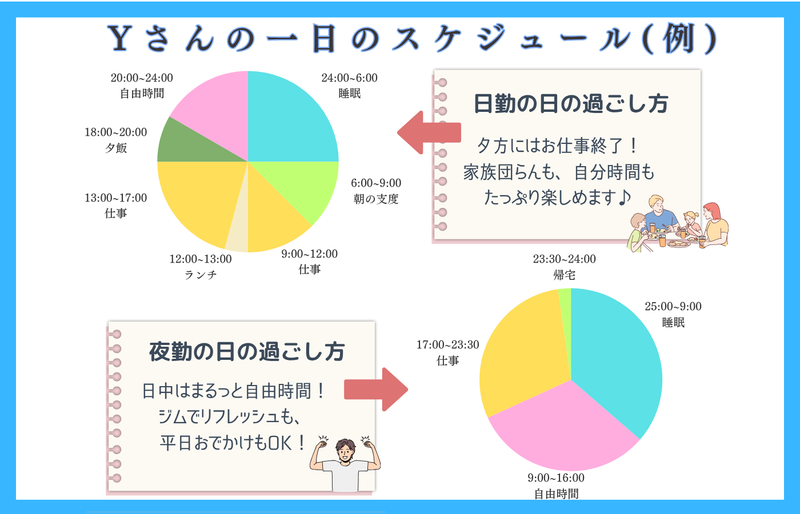 勤務時間詳細 実働時間:1日あたり6時間 〜 7時間30分 平均勤務日数:1ヶ月あたり20日 〜 23日 【1週間ごとの交代制シフト勤務】 ①昼勤:9:00〜17:00(休憩1時間15分) ②夕方勤:17:00〜23:30(休憩30分) ※夕方勤週には「中番勤務(13:30〜19:30)」が1回あり ※基本的に土日休み(土曜日は業務状況に応じて出勤の場合あり) ◇希望休の相談もしやすく、家族の急な体調不良などによるお休みにも柔軟に対応できる職場環境です。