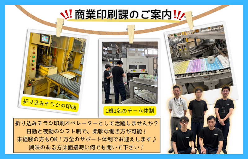 仕事内容 \✨学歴・経験一切不問!高卒・短大卒も大歓迎✨/ ≪✅あかつき印刷で働く魅力≫ ◎勤務時間が短時間! 実働6~7.5時間と印刷業界では珍しい働き方! 短時間だから疲れもたまりにくく、体力に自信がない方も安心です! ◎昼勤と夕方勤のシフト制! 朝が苦手な方でも安心の17時スタートの夕方勤あり! 「昼に予定を済ませてから働きたい」そんな自由な働き方も可能です! ◎ごはんの心配なし! 夕方勤務はお弁当支給あり!お弁当屋さんが休みの日は600円のお弁当代も支給しています! ◎自由に休みやすい環境! チームで助け合いながらシフトを調整。プライベートの予定も立てやすい環境です! ◎お風呂完備でさっぱり帰宅! 作業後は工場の大きめのお風呂でリフレッシュ!汗を流してから気持ちよく帰れますよ♪ ≪✅仕事内容≫ チラシなどを印刷する工場で、印刷機の操作やメンテナンス、印刷準備などを行うお仕事です。 機械を使って生産するスキルを身につけられます! チームで作業を行い、その日その日の印刷スケジュールに合わせて、協力しながら作業を進めていきます。 先輩に聞きながら働ける環境なので安心ですよ! ⏰1日のざっくりな流れ(昼勤の例です!) ▼9:00| 出社・着替え、ミーティング(印刷物の確認・作業内容の共有) ▼9:15〜| 印刷スタート(機械の点検・用紙やインクの準備なども含む) ▼12:00〜13:15| 休憩(60分+別で15時頃に15分の休憩をとっています) ▼13:15〜| 印刷作業の続き ▼16:30| 片付け・翌日の準備 ▼17:00| 退勤 お疲れ様でした! ※夕方勤も流れは同じです! 17時に出社し、23:30くらいに退勤するイメージ! ≪✅社員インタビュー≫ 【▼入社2年目/Yさん/20代】 Q:入社のきっかけは何ですか? A:フリーターをしていた時に、知人の紹介であかつき印刷を知りました。ちょうど仕事を探していたタイミングで、未経験でもOKだったので、応募しました。 Q:仕事のやりがいを教えて下さい! A:元々機械が好きなので、シンプルに楽しいです!あと、印刷物の内容も日によって変わるため、新しいことを知る機会が多いのもやりがいです! Q:あかつき印刷で働く魅力は何ですか? A:働く時間がシンプルに短いです!笑 休みも取りやすくて、プライベートを大切にできるのが嬉しいです! 【▼入社8年目/Kさん/30代】 Q:入社のきっかけは? A:前は営業の仕事をしていて、転職活動中に求人を見かけて、興味を持ち応募しました! Q:あかつき印刷で働く魅力は何ですか? A:働く時間が短くて、趣味の時間がしっかり取れるのがありがたいですね。シフトは昼勤・夕方勤が1週間の交代で、夕方勤のときは昼に銀行とかも行けちゃいます!笑 Q:仕事で大変なことは? A:印刷物の量によって忙しさが変わるので印刷物が多い日には体力を使いますね。ですが、業務が少ない日もありますし、シフトが出るのも早いので、事前に心構えができるのも助かっています! Q:求職者の方へ一言! A:みんなで助け合いながら働ける職場です。未経験の方こそ大歓迎です!ほとんどみんな未経験からのスタートなので!一緒に働けるのを楽しみにしています!