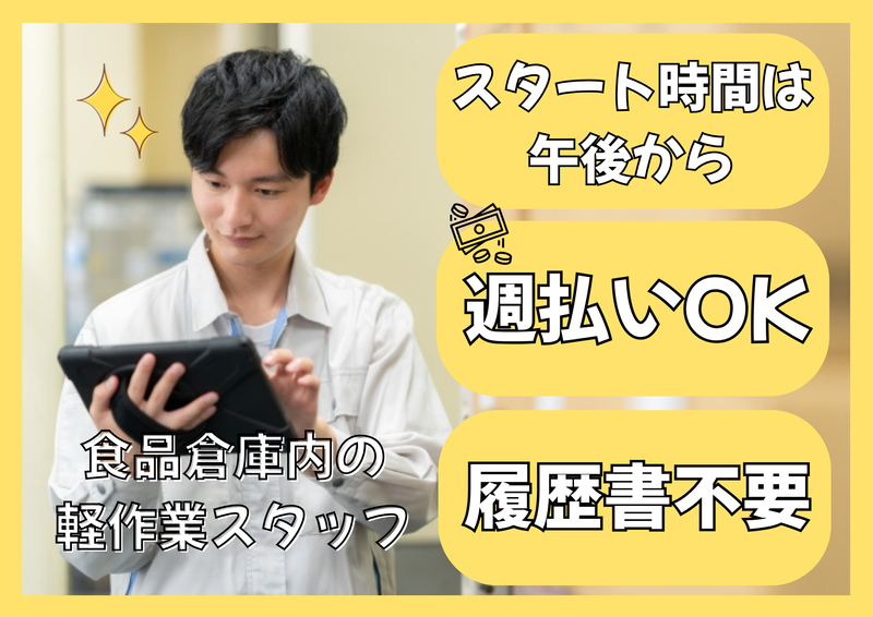 仕事内容 \倉庫内での食品ピッキングスタッフ/ ✅スタート時間は相談OK! ✅未経験歓迎!カンタン作業! ✅履歴書不要で応募OK!面談1回! ✅週払いOK(規定) ✅マイカー通勤OK! ⋆ ✩ ⋆ ┄ ⋆ ✩ ⋆ ┄ ⋆ ✩ ⋆ ┄ ⋆ ✩ ⋆ 【お仕事内容】 居酒屋、スーパー、病院などの施設で 使用される業務用食品のピッキングを お願いします。 ✔リストを見ながら商品をピックアップ ✔仕分けは別担当でピッキングに集中♪ ✔防寒着支給で安心の倉庫内の作業 コツコツ作業が好きな方にピッタリ。 未経験からでもすぐに覚えられる シンプルなお仕事です! *応募方法は……………………* WEBなら1分カンタン応募! 電話での応募も大歓迎です! TEL:011-218-6077 営業時間/10:00~18:00 *…………………………………*