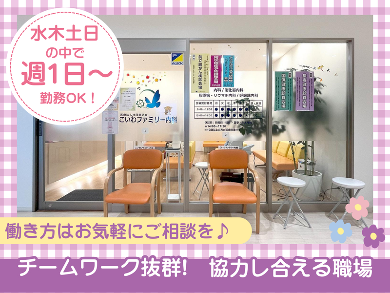 仕事内容 【水木土日の中で週1日~勤務OK】 平日のみ・土日どちらかでもOK 勤務曜日はお気軽にご相談ください♪ ブランクからの復職も安心な チームワーク◎な駅前クリニック ================= ✅これまので経験を活かすチャンス ✅納得&満足な高時給1600~1800円 ✅勤務日数は気軽に相談OK ✅同居家族もOK! グループ医療機関での診療費補助有 【お仕事内容】 内科クリニックでの医療事務全般。 ・患者様の受付 ・会計 ・電話応対 ・予約受付業務 ・健康診断等の予約応対 ・電子カルテ入力 ・院内清掃などの雑務 ================= ⭐地域に親しまれ、患者様も増加中 2021年4月、小岩駅南口すぐの 「FIRSTA 1」ビル5Fにオープンした 内科クリニックです。 院長はリウマチ・膠原病内科の専門医で、 総合内科の診療も行い、地域の方々の 幅広いニーズに応えています。 急な体調不良や発熱外来のほか、 健康診断や各種予防接種、 美容注射などにも対応しており、 院長の専門性を活かした診療を提供しています。 地域に密着したクリニックとして、 スタッフ間のチームワークや コミュニケーションも重視しており、 院長とスタッフが一丸となって 温かくサポートする環境が整っているため、 安心して長く働ける職場です。 ⭐様々な方が働きやすい環境 当院をはじめ、幸訪会グループでは 様々なライフステージの職員の方の 勤務実績があります。 たとえば… *子育てがひと段落して、 職場への復帰をお考えの方 *ご家族の介護が落ち着いて、 久しぶりのお仕事の方 *Wワークであと少しだけ 収入を増やしたい方 *パートから始めて正職員を目指したい方 そのような方も、現場での仕事が 無理のないよう配慮していますので、 とても働きやすい環境ですよ。