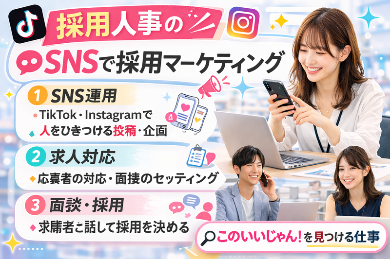 仕事内容: <どんなお仕事?> 一言でいうと「この人いいじゃん!」を見つけるお仕事。 採用人事のアシスタントとして応募者の対応や面接サポートなどを行います。 最近は InstagramやTikTokを使ったSNS採用にも力を入れています。 会社の雰囲気を発信して「ここで働きたい!」と思ってもらうことも大切なお仕事です。 <具体的なお仕事> ・求人サイトの文章作成・応募者とのメッセージ対応・面接の日程調整・面接サポート 慣れてきたら ・TikTok / Instagramの投稿サポート・求人用SNS動画のアイデア出し・応募を増やすアイデアをチームで考える などにも関わることができます。 <未経験でも大丈夫?> 今いるスタッフの多くが未経験スタート。 最初は面接の横で話を聞くところからスタート。 できることから少しずつ覚えていけば大丈夫です。 <この仕事の面白さ> 自分が関わった人が後から活躍している。 そんな瞬間があるとちょっと嬉しくなる仕事です。 人事は「人の味方になる仕事」。 少しでも「面白そう」と思ったらぜひ気軽にご応募ください。 ◇ 未経験でも安心のサポート体制研修期間は1〜3か月。同年代の先輩が横についてサポートします。 OJT研修やマニュアルもあるので分からないことはすぐ相談できます。 今いるスタッフの多くも未経験からスタートしています。 ◇ SNS採用やマーケにも関われるこの仕事では採用だけでなくSNSを使った採用にも関われます。 TikTokやInstagramで会社の雰囲気を発信したり動画のアイデア出しに参加することもできます。 ◇ 自分らしく働ける職場髪型・髪色・ネイル・服装自由。 カフェ店員、アパレル、保育士、コールセンターなど 異業種から転職したスタッフも多数活躍しています。