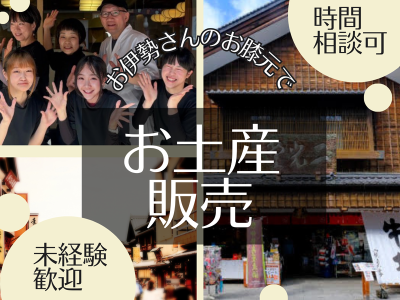 仕事内容 \\急募!!新しいスタッフを大募集// この求人のオススメPoint! ★働きやすさバッチリ →日勤のみ!原則定時退社で プライベート充実します♪ 学生や子育て中の主婦の方や ブランクがある方 年齢・経験問わずに活躍中です! ★応募理由より、人柄重視! →履歴書不要・即面接!友達との応募や 面接時に職場見学も大歓迎です! ★安定企業でリピーターも多い →創業100年の老舗企業です! 土産店・松阪牛専門店・牛串店 伊勢うどんなど幅広く展開! 景気に左右されにくい安定な環境で働けます◎ 展開店舗も多いので リピーターのお客様も多数! 「ありがとう」「美味しかったよ」 「また来るね」という 嬉しいお声がけしてもらえることもあります♪ <<仕事内容>> 全国からの参拝者で賑わう「お伊勢さん」のお膝元で お土産店での業務をお願いします! ◆自分の仕事に集中できます! →出店の揚げ物やお肉の調理は 社員の方が担当するので あなたは、接客とレジがメインです! レジはタッチパネル式で簡単です! ※今後は自動レジを導入予定 ◆防寒対策やサポートもバッチリ◎ 外での勤務ですが暖房器具もあり スタッフの負担軽減や 困りごとへのサポートも積極的に行ってます! ◆休憩・更衣室完備! 冷暖房はもちろん TVも家電完備(電子レンジなど)で お弁当やカップ麺も自由調理OK! 更衣室も別にあるので ON・OFFの切り替え出来て快適です◎ <<働いてるスタッフ>> ◆経験・年齢・学歴不問 →未経験、ブランクがある方OK! 学歴不問!無資格OK! ◆様々な方が活躍中! 学生、主婦(夫)、フリーター 第二新卒・U・Iターン 中高年・ミドル・シニア等々 年齢問わず活躍できます! ◆働き方も自由 扶養内勤務・副業・WワークOK! 家庭との両立や自分のやり方こととの 調整などシフトの自由度は高いです♪