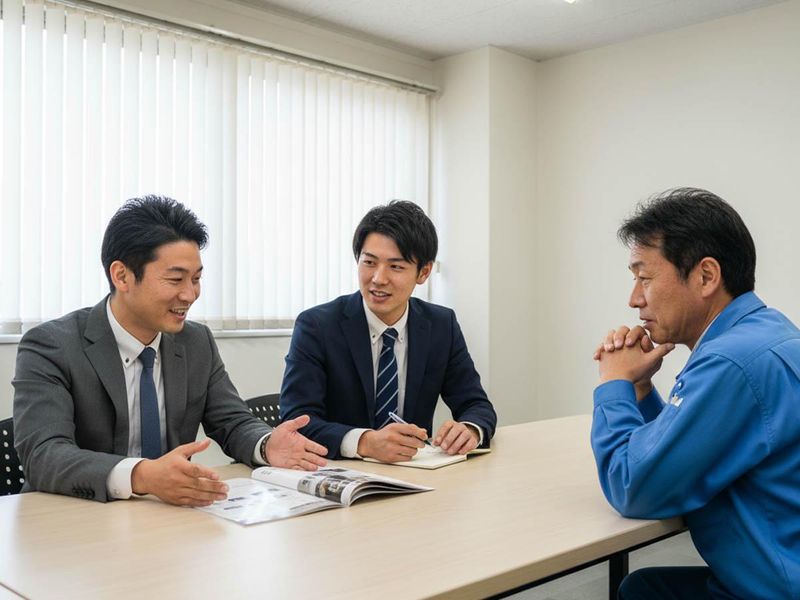【保険制度】 雇用保険、労災保険、健康保険、厚生年金 待遇・福利厚生 【福利厚生】 私たちは、社員が安心してキャリアを再構築できるよう、生活基盤を全力でサポートします。 ① 新生活・I/Uターンサポート ・借上げ社宅制度 月2万円で家具・家電付きのワンルームを 利用可! ・赴任手当あり 月1~5万円を別途支給 (独身者:月3万、既婚者:月5万など)。 ・帰省旅費支給 月2回までの帰省旅費を会社が支給します。 ② 車両サポート(営業活動用) ・営業車貸与 休日はプライベート使用OK! ・自家用車を営業車として持込可能な場合 車両持込手当: 月3万円を支給。 他、ガソリン代(通勤・業務中)全額支給、 オイル交換・エレメント交換費用も会社が 負担します。 ③ 将来・生活の安心サポート ・退職金制度(企業型確定拠出年金制度を導入) ・各種社会保険完備 ・お祝い金(結婚、出産など) ・永年勤続表彰(10年) ・資格取得支援制度あり ・定期健康診断 ・インフルエンザ予防接種補助 ・携帯電話(スマホ)貸与 ・ノートパソコン貸与 ④職場環境 ・フリードリンクあり ・USENあり 音楽を聴きながら、リラックスして働けます。