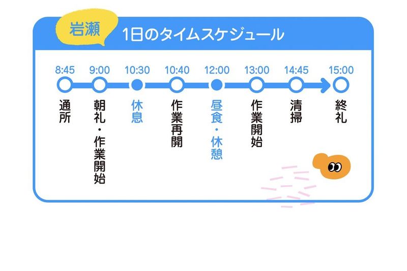 勤務時間詳細 総労働時間:1ヶ月あたり168時間 8:30~17:00 (休憩60分)