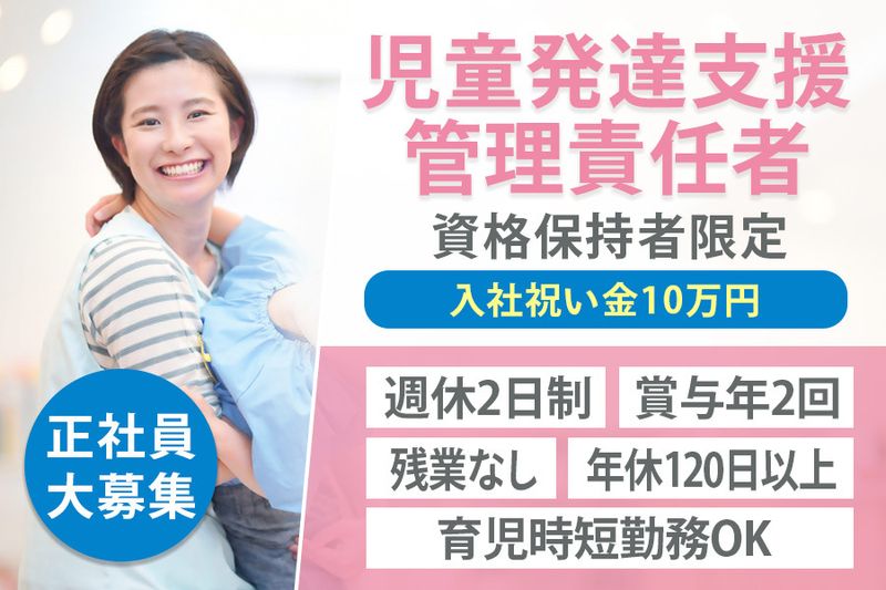 【アピールポイント】 放課後等デイサービスで児童発達支援管理責任者を正社員で募集! ◇入社祝い金10万円 ◇週休2(年休120日)/残業なし ◇資格取得支援/育児時短制度あり 【以下いずれかの方】 ・児童発達支援管理責任者資格お持ちの方 ・サービス管理責任者等基礎研修の受講要件満たしている方