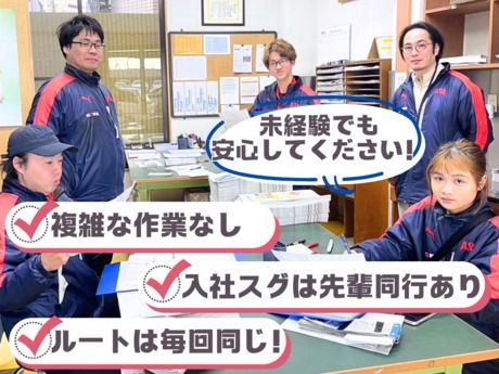 仕事内容 世田谷エリアの新聞配達員 ★給与UPしました ★即入居できる寮完備! ★引越し費用は弊社負担! ★早上がりも可能! ===具体的な業務内容=== ★業務が選べます!★ 【1】配達業務のみ 【2】配達業務+集金業務 【1】新聞配達業務 入社後は先輩同行や順路帳という配達順を記した地図もあるので、未経験でも安心してください! 【2】配達業務+集金業務 *新聞配達業務 *購読中のお客様宅への購読料の集金 ★感謝の言葉をいただくこともあり、やりがいを感じます! ★ご自身でスケジュール調整可能★ ===ASA世田谷で働くポイント=== ★未経験活躍中! *原付免許も不要! *複雑な作業はなし! *新聞配達のルートも毎回同じで、すぐに覚えられます! ★早上がり可能! *勤務時間は余裕のある設定なので、慣れれば早上がり可能! *休憩をはさみながらゆっくり無理なく働くのもOK♪ ※早上がりしても給与保証あり ★幅広いメンバーが活躍してます! *バックグラウンドは様々、色んな方が学生からシニアまで活躍中! *男性だけでなく、女性も多く在籍してます!