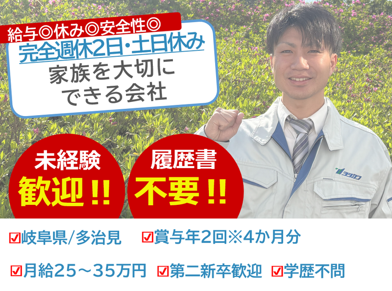 仕事内容 お電話での応募、大大大歓迎です!【電話番号】0572-27-3141⏰ 「まずは話を聞いてみたい」そんな方も、お気軽にお電話ください! ━━━━━━━━━━━━━━━━━━━ ⭐未経験から土木施工管理のプロへ⭐ 資格・経験不問!土日休み&残業少なめ ━━━━━━━━━━━━━━━━━━━ 【求人のポイント!】  ̄ ̄ ̄ ̄ ̄ ̄ ̄ ̄ ̄ ̄ ̄ ̄ ̄ ̄ ̄ ̄ ̄ ̄ ̄ ✅ 未経験から手に職! (資格取得支援あり!着実にスキルアップできます。) ✅ 土日休み&残業少なめ (月平均10時間以内!ワークライフバランスも充実。) ✅ 地域に根差して活躍 (現場は近距離のみ!出張や長距離移動はありません。) ✅人と話すのが好きな方大歓迎◎ ✅DX化推進中!iPad支給・Teamsも積極活用! ■仕事内容  ̄ ̄ ̄ ̄ ̄ ̄ ̄ ̄ ̄ ̄ ̄ ̄ ̄ ̄ ̄ ̄ ̄ ̄ ̄ 公共建築物や民間建築物の新築・リフォーム・修繕工事における、 施工管理業務全般をお任せします。 具体的には、工事の安全管理、品質管理、スケジュール管理、工程管理、協力会社との連携、施工図の作成など多岐にわたります。 「施工管理って難しそう…」と感じる方もいるかもしれませんが、ご安心ください。 当社には未経験からスタートして活躍している社員が多数在籍しています。 私たちが手掛ける案件は、国土交通省や岐阜県、 多治見市などの行政機関からの依頼が多く、 地域社会の発展に貢献できるやりがいのある仕事です。 多治見で話題の観光スポットの施設も、実は当社が施工を担当しました! 現場は多治見市内から無理なく通える範囲なので、通勤の負担も少なく、宿泊を伴う出張や単身赴任もありません。 地域に根差して、安心して 働くことができます。 ■未経験で不安…  ̄ ̄ ̄ ̄ ̄ ̄ ̄ ̄ ̄ ̄ ̄ ̄ ̄ ̄ ̄ ̄ ̄ ̄ ̄ 未経験から活躍している社員が実際に在籍。 当社が全力でバックアップ致します! 「経験ないけど大丈夫かな・・」 「現場の雰囲気が分からないから怖いな・・」 どんな小さな不安も教えてください! まずは元気があれば問題ありません! 周りの先輩たちがしっかりサポートします◎ ■入社後は…  ̄ ̄ ̄ ̄ ̄ ̄ ̄ ̄ ̄ ̄ ̄ ̄ ̄ ̄ ̄ ̄ ̄ ̄ ̄ 安全管理や工程管理など 基本的な知識を学んでいただきます(約半年間) ↓ 実際の現場における業務や外部研修に参加。 研修後は先輩と一緒に現場を担当し、 OJT中心に実際の業務の中で経験を積んでいただきます! (約半年間) ↓ 2年目以降は小規模現場から担当しながら 資格取得を目指して働いていきます! ◆分からないことがあったらすぐに相談できる環境が整っております◆ はじめは ” わからない ” のが当たり前! 大事なのは、わからないことをそのままにせず、 その都度聞いて、わからないことを放置しないこと◎ 時間をかけてできることを増やしていきましょう!! ■アピールポイント  ̄ ̄ ̄ ̄ ̄ ̄ ̄ ̄ ̄ ̄ ̄ ̄ ̄ ̄ ̄ ̄ ̄ ̄ ̄ ✨【未経験歓迎!】資格や経験は一切不問!あなたの「やってみたい」という気持ちを応援します。 ✨【働きやすい環境!】土日休み(完全週休二日制)で残業も月平均10時間以内。プライベートも充実できます。 ✨【地域貢献!】手掛けるのは公共事業が中心。地図に残る仕事で、地域社会の発展に貢献できます。 ■求める人材  ̄ ̄ ̄ ̄ ̄ ̄ ̄ ̄ ̄ ̄ ̄ ̄ ̄ ̄ ̄ ̄ ̄ ̄ ̄ 過去の経験や資格は問いません! 元気があり、 新しいことに積極的にチャレンジできる方を求めています。 体を動かすことに抵抗がなく、コミュニケーションを取りながら仕事を進めるのが好きな方、 地域社会に貢献したいという意欲のある方をお待ちしています! まずはあなたの「やってみたい!」という気持ちを聞かせてください。 //////////////////// 電話でのお問い合わせもお待ちしております✨ 057-227-3141(採用担当)まで //////////////////// ■当社につきまして  ̄ ̄ ̄ ̄ ̄ ̄ ̄ ̄ ̄ ̄ ̄ ̄ ̄ ̄ ̄ ̄ ̄ ̄ ̄ \1930年に設立し、2024年で94周年を迎えます/ 多治見市を中心にして、土木・建築の事業をしております。 公共工事をはじめ、商業施設や住宅の建築、リフォームなども手掛けてまいりました。 年間のご依頼実績は毎年更新し、 法人から個人まで、多くのお客様に信頼される 総合建築会社として成長を続けています。