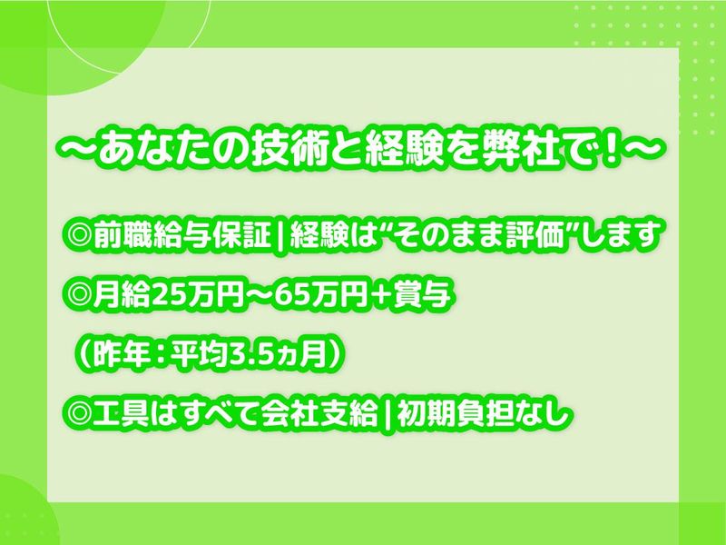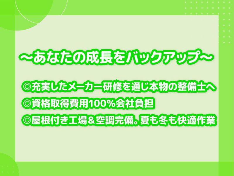 求めている人材 ・自動車整備士3級以上の方※経験不問 ・普通自動車免許(AT限定可)をお持ちの方 【経験を十分に考慮し優遇します】 ・自動車整備士3級以上の資格を有し、且つ整備士の実務経験がある方は、前職給与を保証&経験を考慮し給与優遇します ◎性別不問 ◎20代30代40代50代が活躍中! ◎福利厚生充実!安定して働きたい方にピッタリ 「経験が浅い」「ブランクがある」などで躊躇されている方も大歓迎!研修が充実しており、入社後にスキルUP可能です。 【成長のカギは“楽しむこと”】 ここでは、車1台1台に向き合う、あなたが整備士を目指したときに描いた本来の仕事ができます。だから、こんな方法があるんだ!という発見の連続。ワクワクする仕事がココではできます!