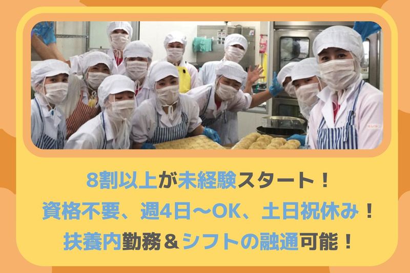仕事内容 ⏩ブランク/未経験歓迎! 特別な資格や経験は一切必要ありません! 「子どもの急な熱で…」 「学校行事があって…」 そんな時も休みやすい環境を整えています。 子育てと無理なく両立できます!✨ ┏━━━━━━━━━━┓ ◆ アピールポイント ◆ ┗━━━━━━━━━━┛ ⭐8割以上が未経験スタート! 自分のペースでコツコツ頑張れる方を しっかりサポートする環境が整っています。 ⭐扶養内勤務&シフトの融通◎ 週4日~OK!ご家庭の都合を最優先! 急なお休みにも柔軟に対応します。 ⭐子どもたちの笑顔がやりがい! 「今日の給食、おいしかった!」 その一言が、何よりの喜びです。 ┏━━━━━━━┓ ◆ お仕事内容 ◆ ┗━━━━━━━┛ 小中学校の給食室で、 調理師さんのサポートをお願いします✨ 簡単な作業からなので安心ください! ✅野菜を洗ったり、皮をむいたり ✅決まった大きさに野菜をカット ✅おかずをクラスごとに盛り付け ✅食器や調理器具の洗浄(洗浄機あり!) まずは簡単なことからスタート! あなたのペースに合わせてお教えします。 ⏰主婦Aさんの1日の流れ⏰  ̄ ̄ ̄ ̄ ̄ ̄ ̄ ̄ ̄ ̄ ̄ ̄ ̄ ̄ ̄ 9:00 ⏩ みんなで野菜の皮むき&カット 11:00 ⏩ 出来上がった給食をクラスごとに分ける 12:00 ⏩ 休憩タイム♪ 13:00 ⏩ 食器や調理器具の片付け 14:30 ⏩ 翌日の準備をお手伝い 15:00 ⏩ 「お疲れ様でした!」夕飯の買い物へ ⭐子育てママに嬉しい環境  ̄ ̄ ̄ ̄ ̄ ̄ ̄ ̄ ̄ ̄ ̄ ̄ ̄ 勤務時間は15時までなので、 お子さんのお迎えにも余裕で間に合います。 さらに、土日祝に加えて 夏休み・冬休み・春休みも お子さんと全く同じお休み! 長期休暇のたびに預け先を探す 心配もありません。 ┏━━━━━━━━━━┓ ◆ 先輩スタッフの声 ◆ ┗━━━━━━━━━━┛ ✨40代/勤続3年目✨  ̄ ̄ ̄ ̄ ̄ ̄ ̄ ̄ ̄ ̄ ̄ ̄ 「子どもが小学校に上がり、 10年ぶりに仕事を始めました。 最初は不安でしたが、周りの皆さんも 同じ主婦の方が多くて、 子どもの話で盛り上がったりと すぐに馴染めました。 子どもの体調不良で急に休む時も 『大丈夫だよ!』と快く言ってくれるので 本当に働きやすいです。 扶養内で働けるのも助かっています!」