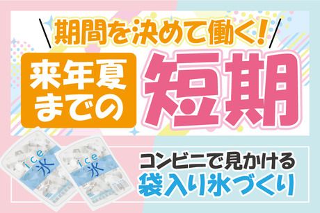 仕事内容 【 注目ポイントはココ! 】 □来年夏までの短期!期間を決めて働く! □未経験から始めたスタッフが多数! □単純作業ばかりなのでスグ慣れる! □17時まで&残業なしで働きやすい! □時給1350円でムリなく安定収入! □続けられそうなら長期は切替も相談OK! 【 お仕事内容 】 コンビニやスーパーなどで見かける 「袋入り氷」の製造補助業務です。 ◆装置のボタンを押して氷を袋にいれる ◆氷の入った袋を移動させる ◆袋や段ボールの補充 と、かんたんでシンプルな作業になります。 ライン作業ではないので、 自分のペースで進めていくことができます。 接客業務ではないので、 モクモクと作業を進めていける方なら大歓迎します! 【 期間限定のオシゴト 】 来年夏までの期間限定のお仕事★ 働いてみて「続けられそう!」 と思ったら長期への切り替えもOK! お気軽にご相談ください♪ 社会保険や有休などの福利厚生はもちろん 環境面も充実の職場。 日曜以外の休みは希望も2週間ごとに出せるので 予定とも合わせやすいとスタッフからは好評です。 また残業はないので、基本、定時退社。 プライベートの時間も充実できます◎ \入社日はお気軽にご相談ください/ 勤務開始日は柔軟に対応しますので、 無理のないタイミングで大丈夫です♪ 年始からのスタートも気軽にご相談くださいね。 応募後は面談→職場見学→仕事開始! 面談時は履歴書の準備は必要ありません◎ WEB面談の場合は、 日程の予約も参加もURLをクリックするだけでOK! 応募画面で必要事項を入力いただければ SMSやメールアドレスに面談予約用のURLが送られます。 あとは希望の面談日程を選択して予約完了! 面談可能な日程を多数準備しているので 「スグにでも働きたい」という希望にもお応えできます。 ネットさえ繋がればどこからでも参加可能です。 もちろん電話面談も対応できます! 電話で担当者と話をしていくだけなので こちらも事前に履歴書を準備することなく参加いただけます。