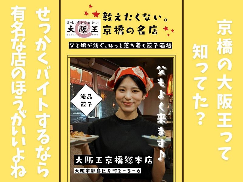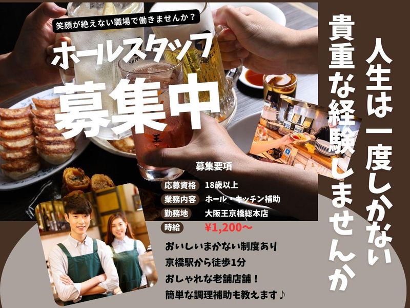 仕事内容 \ 笑顔で明るく挨拶しよう! / おいしい餃子が人気なお店です! 京橋では誰もが知る老舗餃子酒場! 100席ある大型店舗 【 ホールスタッフ 】 ・オーダー取りや接客 ・料理、ドリンクの提供 ・テーブルの片づけ など ホール業務全般をお願いします! 希望があればキッチンもお任せ! \オススメPOINT/ ・1日3h~ok!柔軟なシフト ・京橋の老舗餃子居酒屋 ・賄い支給あり*食費節約にも。 ・20代中心に学生さんが多数活躍中!