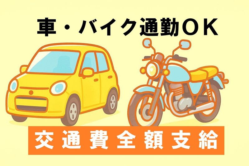 【保険制度】 雇用保険、労災保険、健康保険、厚生年金 待遇・福利厚生 【福利厚生】 ・有給休暇あり ・交通費全額支給 ・車バイク通勤OK ・食堂利用可(昼食持参可・格安弁当あり)