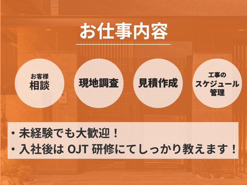 アピールポイント: ーーーーーーーーーーーーーーー ・20〜30代が活躍中! ・キャリアアップ可能な環境! ・福利厚生充実! ・転勤なし! ・資格取得支援あり! ・長期休暇でリフレッシュ可! ・八王子市、町田市、日野市、相模原市緑区、相模原市中央区、相模原市南区からの通勤者多数! ・男性、女性共に産休育休実績あり ーーーーーーーーーーーーーーー 【当社について】 当社は東京都・神奈川県を中心に、年間2,000棟以上の住宅外構・エクステリア工事を施工する総合建設企業です。 外構・基礎・土木・タイル・リフォーム・不動産まで幅広く事業展開しています。 ーーーーーーーーーーーーーーー 【フロンティア建設で働く魅力】 ① 自分の力を試せる環境 ② お客様に直接喜んでもらえるやりがい ③ 何もないところから形にしていくモノづくりの楽しさ ーーーーーーーーーーーーーーー 【将来のキャリア】 ・事業部責任者や幹部を目指す ・新規事業を立ち上げる → 社内ベンチャー制度あり!会社が全面的にサポートします。 ーーーーーーーーーーーーーーー