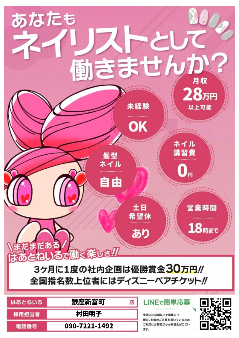 アピールポイント: ☘︎稼げる高額インセンティブ︎ ☘︎指名料93%バック ●福利厚生充実! ✵接客など、その他サロンに関わる業務全て ✵経験者はもちろん、未経験者の方でも1からネイルを学べる研修制度がありますので、安心してご応募ください。 ⋆⸜ キャリアアップを目指せる ⸝⋆ ❋無資格未経験OK! ❮実績❯ ❋未経験➡︎1年でマネージャー昇格 ❋経験者➡︎優遇有ㅤ アピールポイント 〔営業時間➡︎10:00~18:00〕 だ・か・ら!! ꒰⑅ 仕事とプライベート充実 ⑅꒱ㅤ ✽ネイルサロンで18時退社はここだけ! ✽プライベートも充実◎ㅤ ☆ はあとねいるの魅力 ☆ ꕤ 18時まで営業だから働きやすい! ꕤ 有料級の研修あり! ⇨ なんと費用0円!!(条件あり) ꕤ 実際に働いているネイリストの95%が未経験だから安心◎ ⬇︎3ヶ月に1回の社内企画!⬇︎ ⋱ ネイルバトルチャンピオン ⋰ 2025年12月迄実施※しばらくの間お休み 優勝賞金30万獲得も夢じゃない! ㅤ ● 給与や働き方の魅力 ●ㅤ ꕤ 高収入!昇給あり! ꕤ 無資格でも店長スクール講師になれる! ꕤ 会社本部への異動配属も可能! ꕤ ネイル業界1位を一緒に目指せる! ꕤ シフトで休日が取りやすい! ♡ 条件は技術ではなく ⸜はあと⸝ と *思いやり* ♡ 【オープニングスタッフ募集】 はあとねいる銀座新富町店は10月13日グランドオープンいたしました。素敵なネイリストさんを募集しております。 「セカンドオープニングから関わってみたい!」「新しい環境でチャレンジしたい!」 そんな方にもピッタリです! サロンが18時までなので、18時半には退社でき、銀座まで歩いて6分程度で到着できる好立地!プライベートも充実できます! また勤務時間帯のご相談も可能です。 ⋱ ⋱ 11:00~20:00、12:00~21:00など⋰ ⋰ 「本気で挑戦する人」を応援し、サポートさせて頂きます。 なぜならオーナーが本気で募集し、本気で挑戦している新規事業だからです! あなたの時間も私の時間も大切です。お金よりも大切な時間を無駄にしたくないのです。是非、ご一緒にサロン作りをしていきませんか!